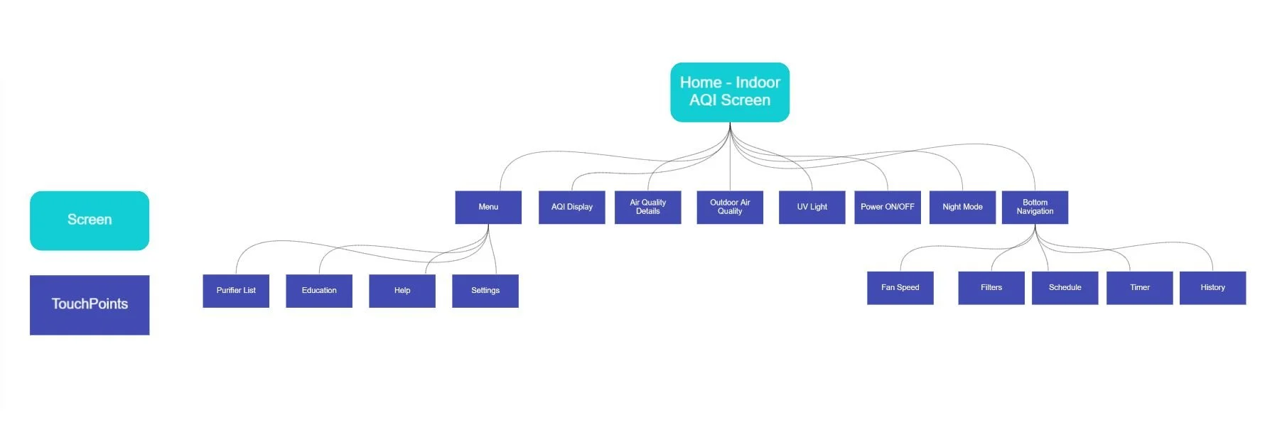 Constructed the high-level app screen flow to understand what screens needed to be designed. Initial assumptions were to include 2-state buttons - ON/OFF- for quick access and the AQI display on the main screen and the multi-control buttons on the bottom navigation. The menu would include all informational content and high level list views of all the purifiers connected.