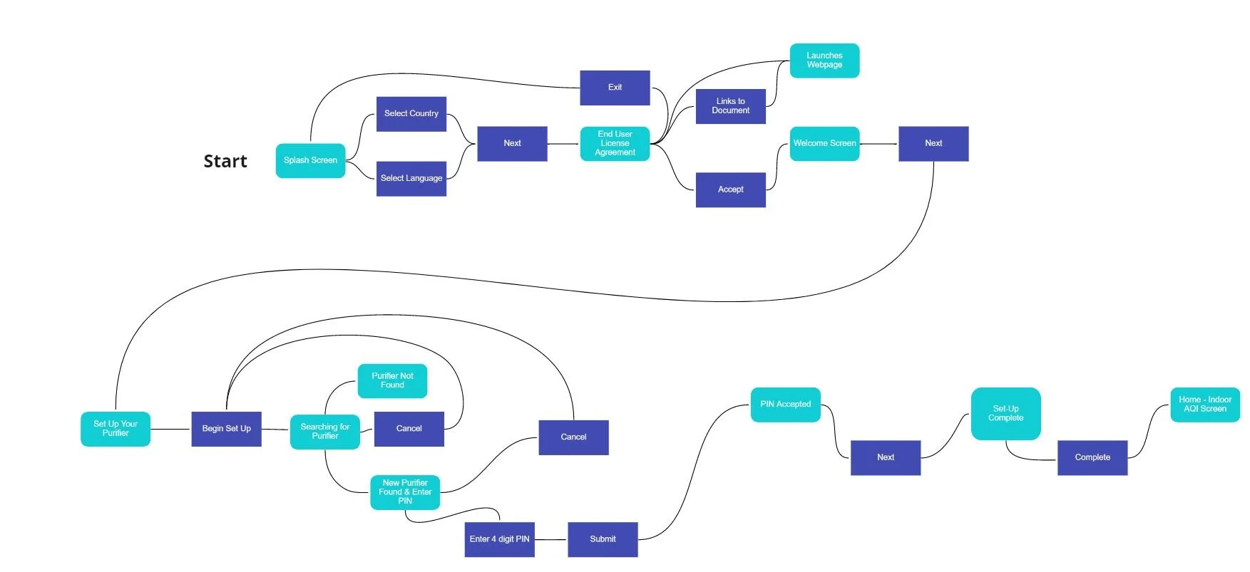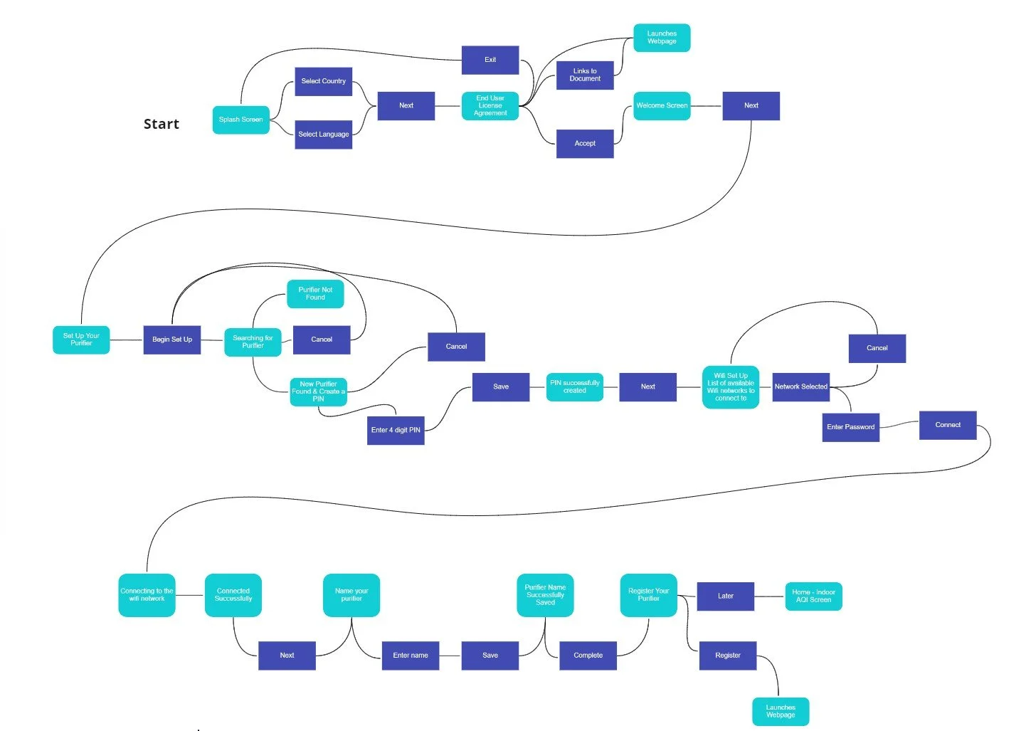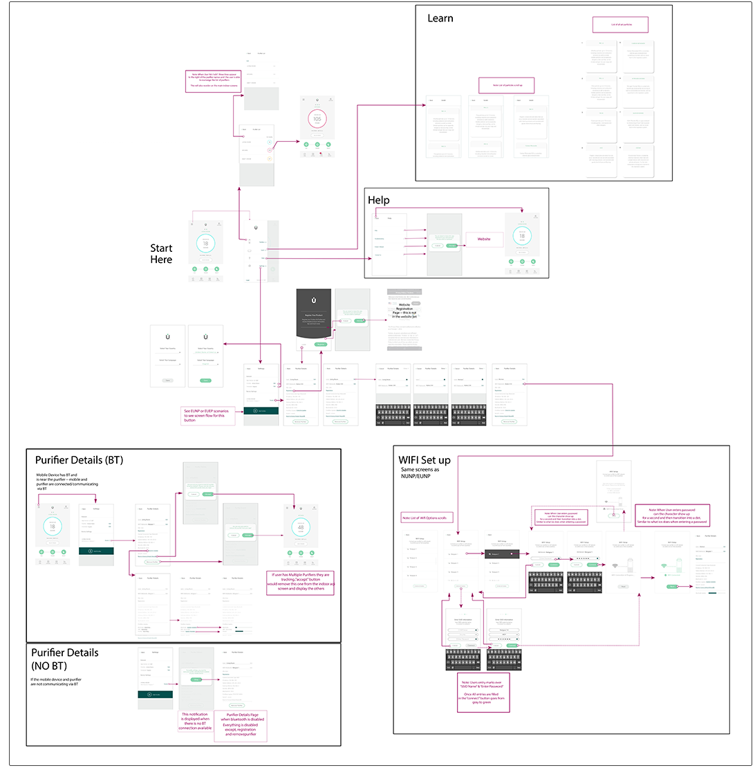 Planning the onboarding experience was essential in distinguishing what screens we needed to create and the differences between the four scenarios identified. The four scenarios included: New App User + New Purifier, Existing App User + New Purifier, New App User + Existing Purifier, & Existing App User + Existing Purifier.