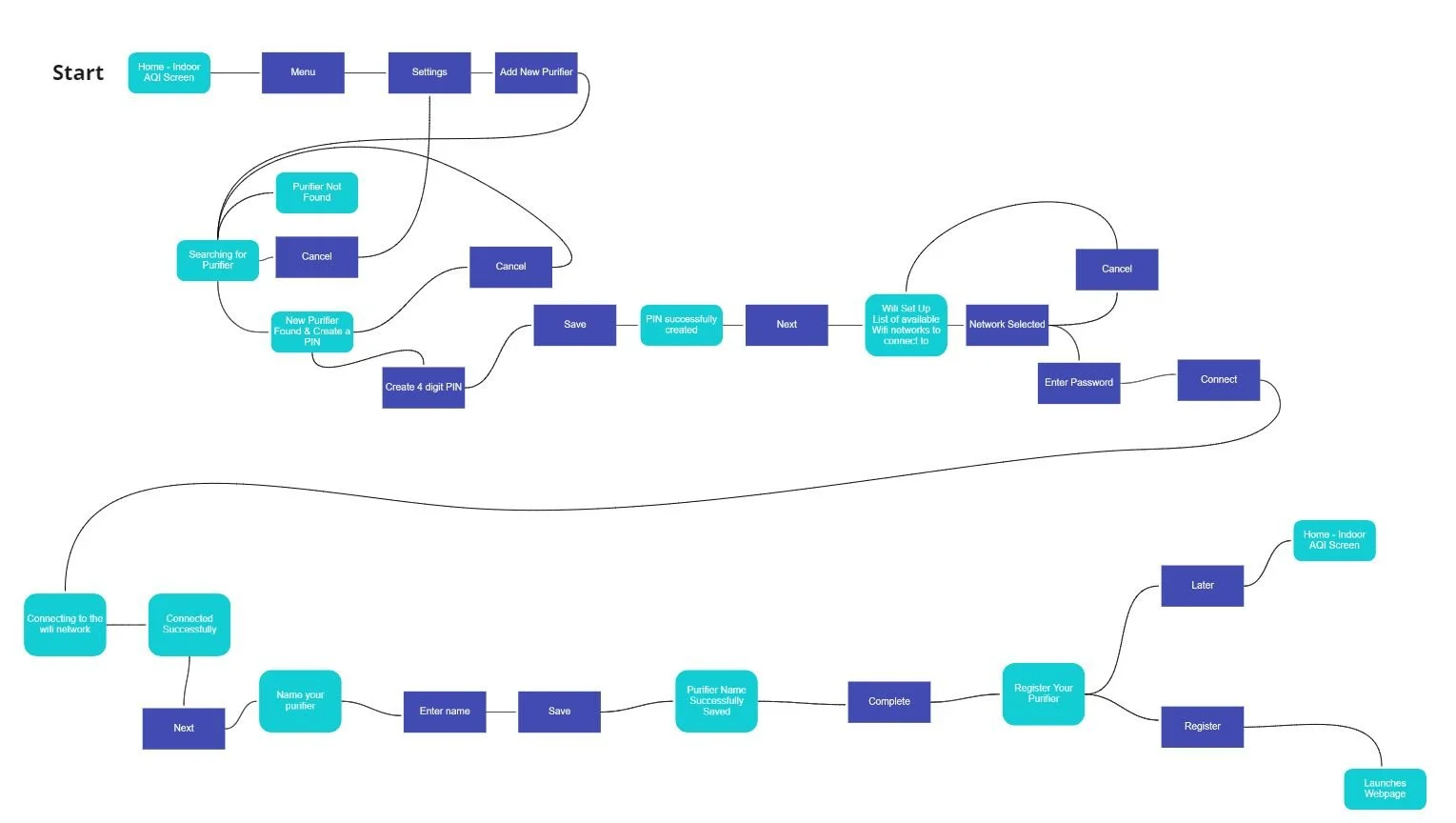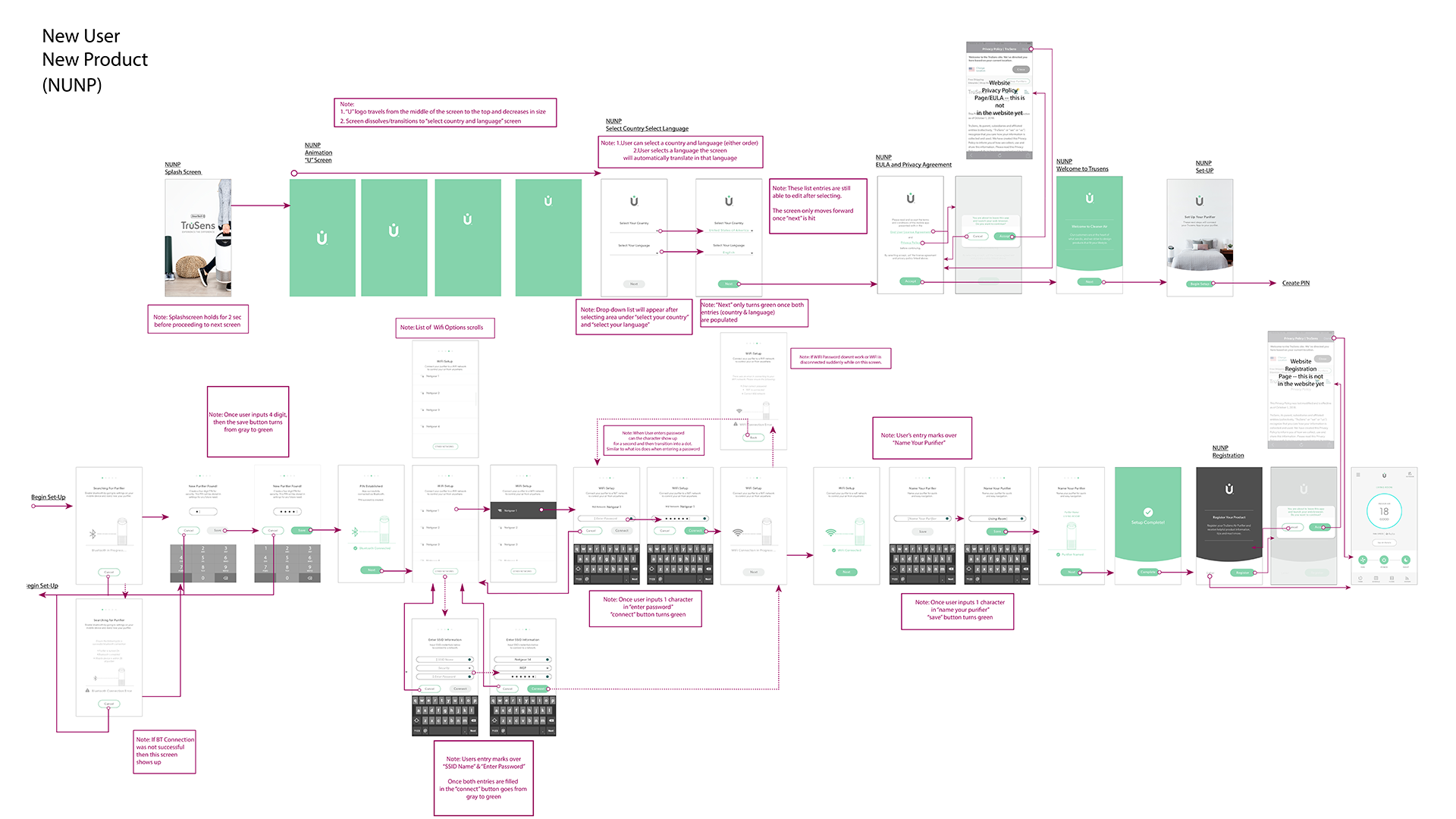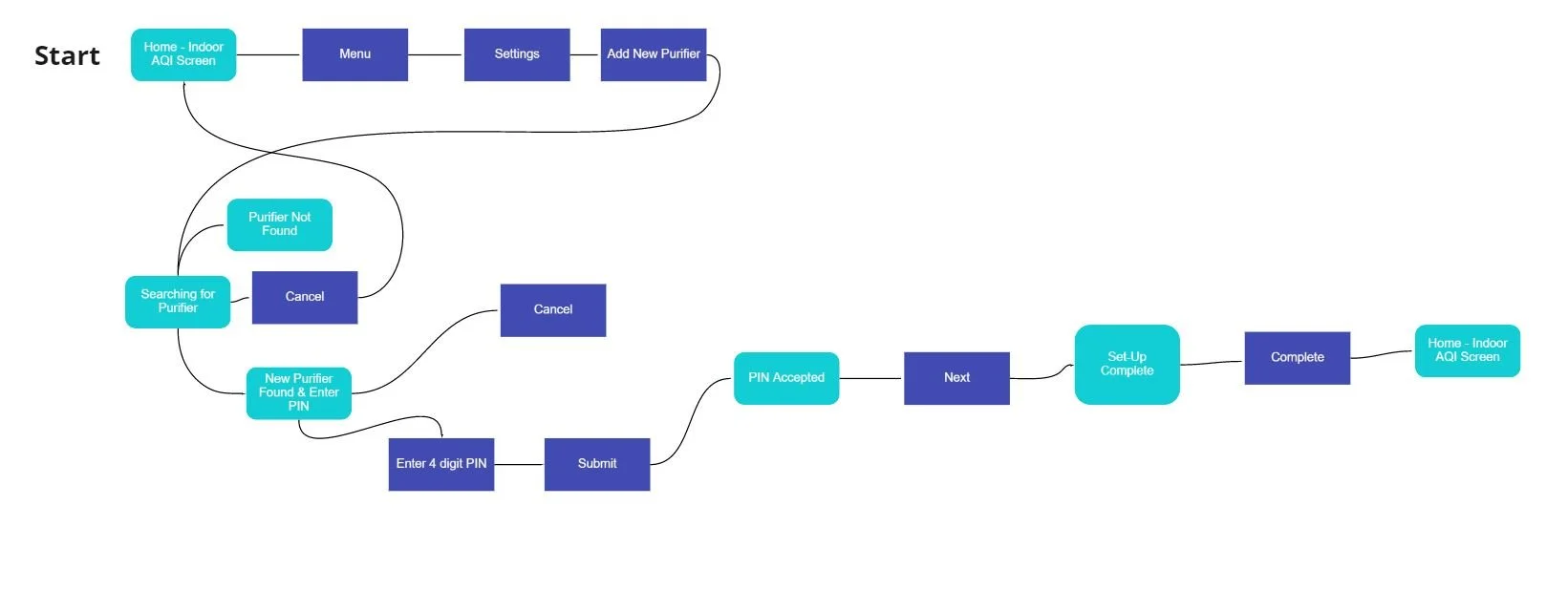 Planning the onboarding experience was essential in distinguishing what screens we needed to create and the differences between the four scenarios identified. The four scenarios included: New App User + New Purifier, Existing App User + New Purifier, New App User + Existing Purifier, & Existing App User + Existing Purifier.
