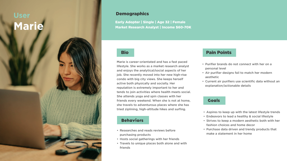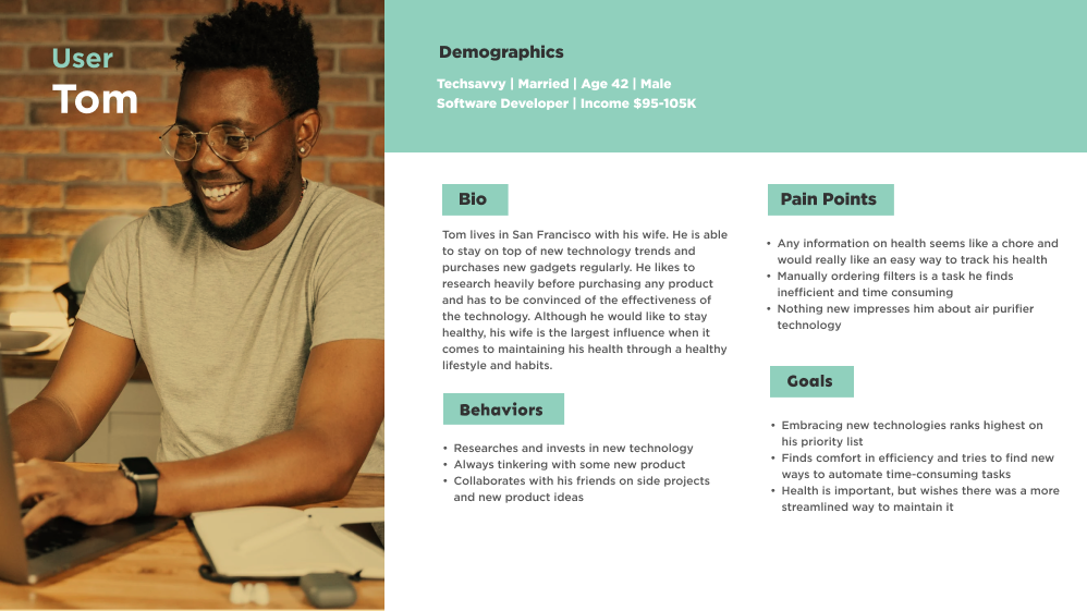 After initial meetings with the TruSens team, I learned about prior user interviews that were conducted for the first purifier launch and had a chance to review the user research. After analyzing the interview responses, some themes were identified and updated personas were created to guide the digital experience.