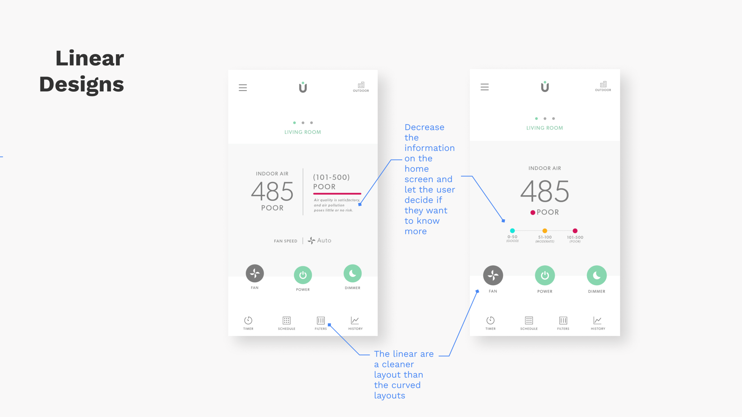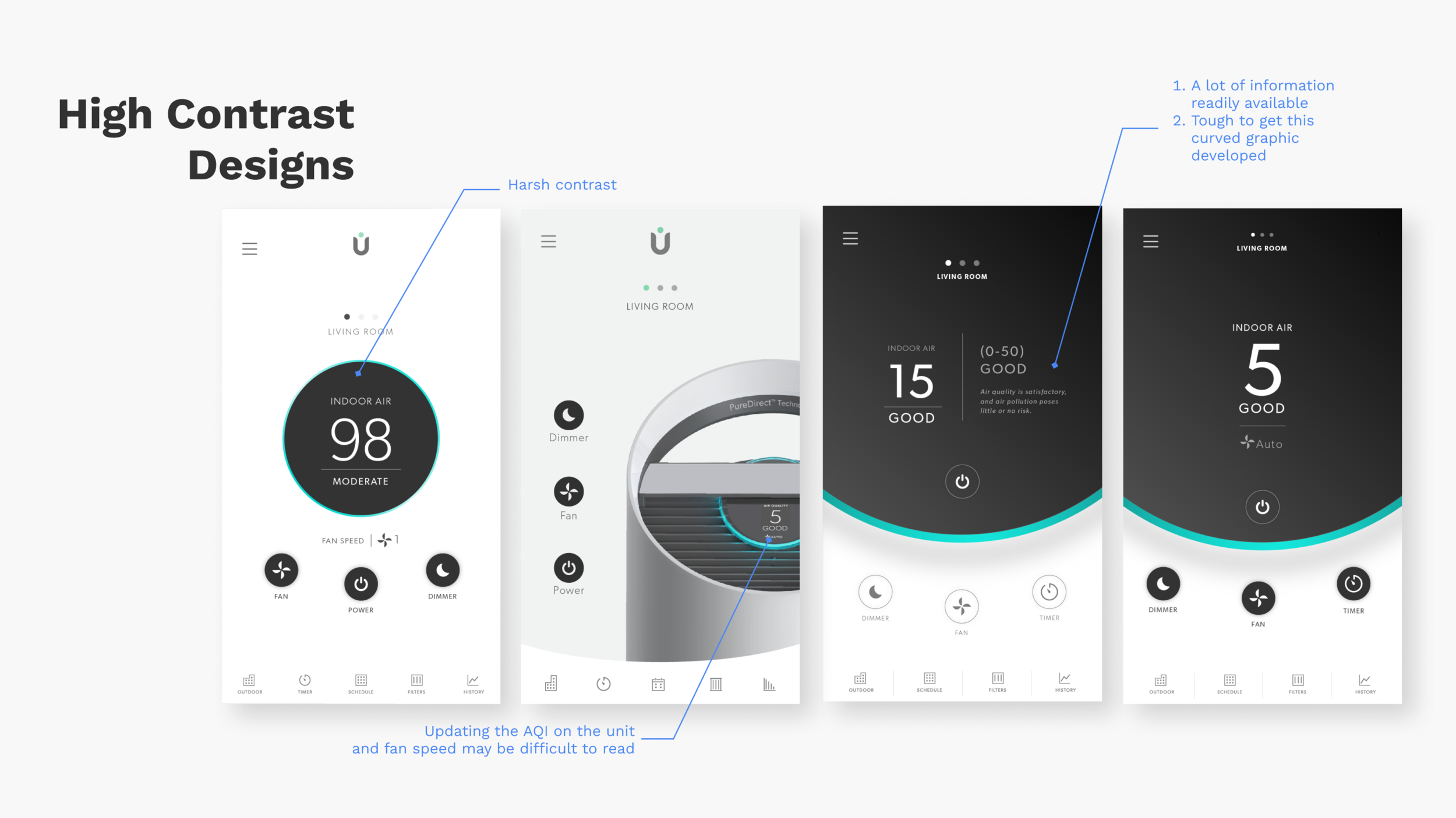 Based on the information architecture exercise, designed medium fidelity screens to start evaluating layout and placement. Tested these designs with my cross functional team and decided to rearrange the button arrangement slightly to eliminate the option to adjust the UV light. The reasoning was to eliminate complexity and to highlight the most frequently used buttons (fan speed, power button, and night mode) on the current purifier unit.